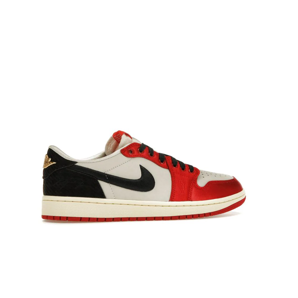 The Air Jordan 1 Retro Low OG Trophy Room “Away” is a premium collaboration celebrating Michael Jordan’s legacy. Featuring a sleek combination of red, sail, and black suede with gold accents, it nods to the iconic Chicago Bulls colors. The design includes co-branded detailing and storytelling elements unique to Trophy Room. Aged midsoles and vintage-inspired aesthetics complete the nostalgic look. This limited release blends heritage, style, and exclusivity.